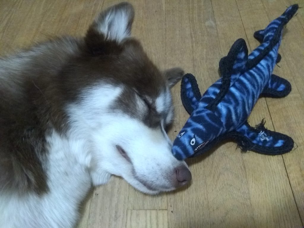Suki was sleeping and a land shark came up and bit her in the nose. When later asked about the shark attack Suki said, “No big woof!”. No stuffed land sharks where harmed during the production of this article. Suki did bite on the shark later however.